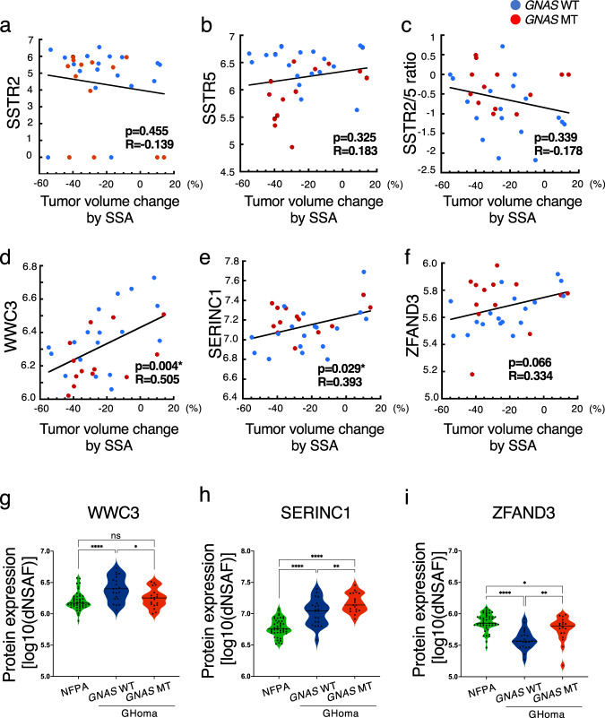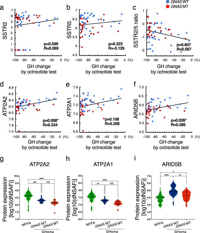 The clinical characteristics of growth hormone (GH)-producing pituitary adenomas/somatotroph pituitary neuroendocrine tumors (GHomas/somatotroph PitNETs) vary across patients. In this study, we aimed to integrate the genetic alterations, protein expression profiles, transcriptomes, and clinical characteristics of GHomas/somatotroph PitNETs to identify molecules associated with acromegaly characteristics. Targeted capture sequencing and copy number analysis of 36 genes and nontargeted proteomics analysis were performed on fresh-frozen samples from 121 sporadic GHomas/somatotroph PitNETs. Targeted capture sequencing revealed GNAS as the only driver gene, as previously reported. Classification by consensus clustering using both RNA sequencing and proteomics revealed many similarities between the proteome and the transcriptome. Gene ontology analysis was performed for differentially expressed proteins between wild-type and mutant GNAS samples identified by nontargeted proteomics and involved in G protein-coupled receptor (GPCR) pathways. The results suggested that GNAS mutations impact endocrinological features in acromegaly through GPCR pathway induction. ATP2A2 and ARID5B correlated with the GH change rate in the octreotide loading test, and WWC3, SERINC1, and ZFAND3 correlated with the tumor volume change rate after somatostatin analog treatment. These results identified a biological connection between GNAS mutations and the clinical and biochemical characteristics of acromegaly, revealing molecules associated with acromegaly that may affect medical treatment efficacy.