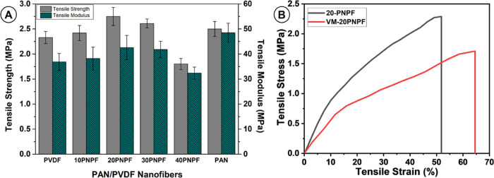 Two-component self-healing carbon/epoxy composites were fabricated by incorporating healing agents between to carbon fiber laminates via the vacuum bagging method. Vinyl ester (VE), cobalt naphthalene (CN), and methyl ethyl ketone peroxide (MEKP) were encapsulated in a polyacrylonitrile (PAN)/Poly(vinylidene fluoride) (PVDF) shell via co-axial electrospinning. Varying nanofiber compositions were fabricated, namely, 10, 20, 30, and 40% PAN in PVDF nanofibers. The 20% PAN fibers were finalized as the shell material owing to their superior tensile properties and surface morphology. The behavior of the PAN/PVDF nanofibers encapsulating the healing agents was studied via Fourier-transform infrared spectroscopy (FTIR), field emission scanning electron microscopy (FESEM), and thermogravimetric analysis (TGA) to affirm the presence of the healing agents. Mechanical analysis in the presence of core-shell nanofibers indicated an enhancement of 7 and 5% in flexural strength and Izod impact strength, respectively. Three-point bending tests confirmed the autonomous healing characteristics of these nanofibers, which retained 62% of their initial strength after 24 h. FESEM and energy dispersive X-ray (EDX) analyses of the fracture surface confirmed that the resin was released from the nanofibers, restoring the initial properties of the composites.