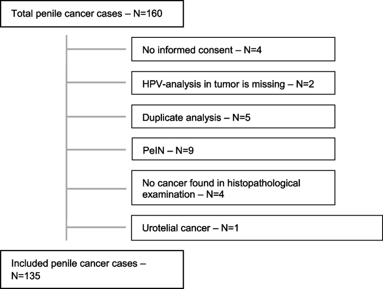 Background: HPV has been detected in approximately 50% of invasive penile cancers but with a large span between 24 and 89%, most likely due to different types of tumors and various methods for HPV analysis. Most studies of HPV in penile cancer have been performed using paraffin-embedded tissue, argued to be at risk for contaminated HPV analysis. Viral activity of HPV, by the use of HPV mRNA expression is well studied in cervical cancer, but seldom studied in penile cancer. The aim was to determine prevalence of HPV types in fresh tissue of penile cancers compared to non-malignant age-matched penile controls. Additional aims were to analyze the viral expression and copy numbers of HPV16-positive tumors and 10 mm adjacent to the tumor.