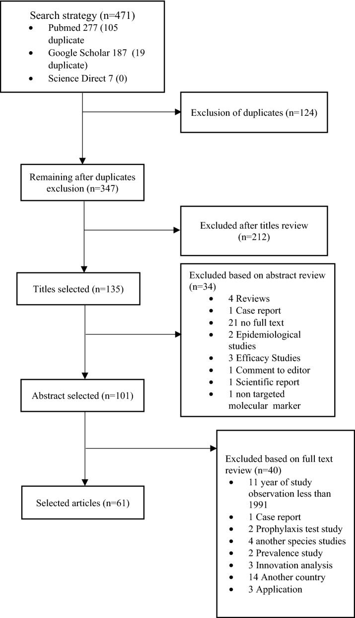 This review article aims to investigate the genotypic profiles of Plasmodium falciparum and Plasmodium vivax isolates collected across a wide geographic region and their association with resistance to anti-malarial drugs used in Indonesia. A systematic review was conducted between 1991 and date. Search engines, such as PubMed, Science Direct, and Google Scholar, were used for articles published in English and Indonesian to search the literature. Of the 471 initially identified studies, 61 were selected for 4316 P. falciparum and 1950 P. vivax individual infections. The studies included 23 molecular studies and 38 therapeutic efficacy studies. K76T was the most common pfcrt mutation. K76N (2.1%) was associated with the haplotype CVMNN. By following dihydroartemisinin-piperaquine (DHA-PPQ) therapy, the mutant pfmdr1 alleles 86Y and 1034C were selected. Low prevalence of haplotype N86Y/Y184/D1246Y pfmdr1 reduces susceptibility to AS-AQ. SNP mutation pvmdr1 Y976F reached 96.1% in Papua and East Nusa Tenggara. Polymorphism analysis in the pfdhfr gene revealed 94/111 (84.7%) double mutants S108N/C59R or S108T/A16V in Central Java. The predominant pfdhfr haplotypes (based on alleles 16, 51, 59,108, 164) found in Indonesia were ANCNI, ANCSI, ANRNI, and ANRNL. Some isolates carried A437G (35.3%) or A437G/K540E SNPs (26.5%) in pfdhps. Two novel pfdhps mutant alleles, I588F/G and K540T, were associated with six pfdhps haplotypes. The highest prevalence of pvdhfr quadruple mutation (F57L/S58R/T61M/S117T) (61.8%) was detected in Papua. In pvdhps, the only polymorphism before and after 2008 was 383G mutation with 19% prevalence. There were no mutations in the pfk13 gene reported with validated and candidate or associated k13 mutation. An increased copy number of pfpm2, associated with piperaquine resistance, was found only in cases of reinfection. Meanwhile, mutation of pvk12 and pvpm4 I165V is unlikely associated with ART and PPQ drug resistance. DHA-PPQ is still effective in treating uncomplicated falciparum and vivax malaria. Serious consideration should be given to interrupt local malaria transmission and dynamic patterns of resistance to anti-malarial drugs to modify chemotherapeutic policy treatment strategies. The presence of several changes in pfk13 in the parasite population is of concern and highlights the importance of further evaluation of parasitic ART susceptibility in Indonesia.