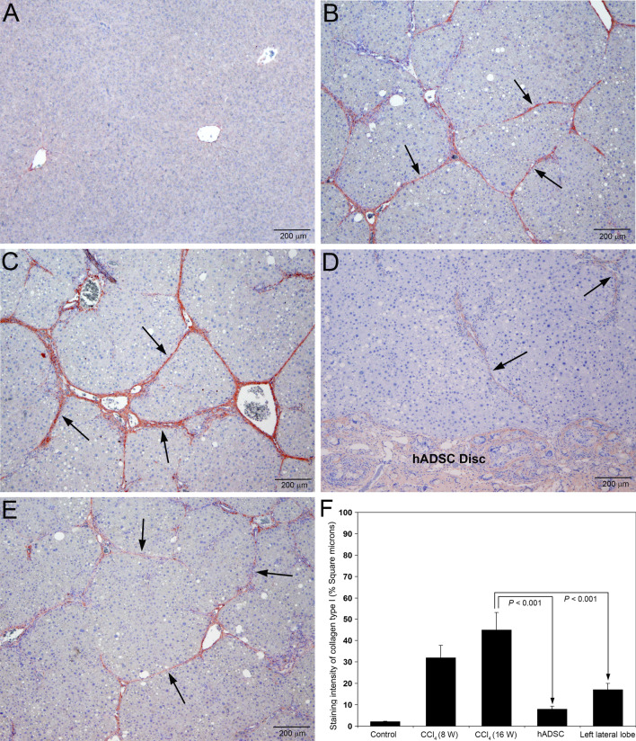 Results: Serial administrations of CCl4 resulted in well developed fibrosis and early cirrhosis at 8th week which maintained until the 16th week. Animals treated with hADSC discs depicted over 50% decrease of collagen with significant increase in serum albumin and total protein levels. Immunohistochemical staining for TGF-β1, α-smooth muscle actin, and collagen type I and type III demonstrated marked decrease compared to the animals without hADSC treatment.