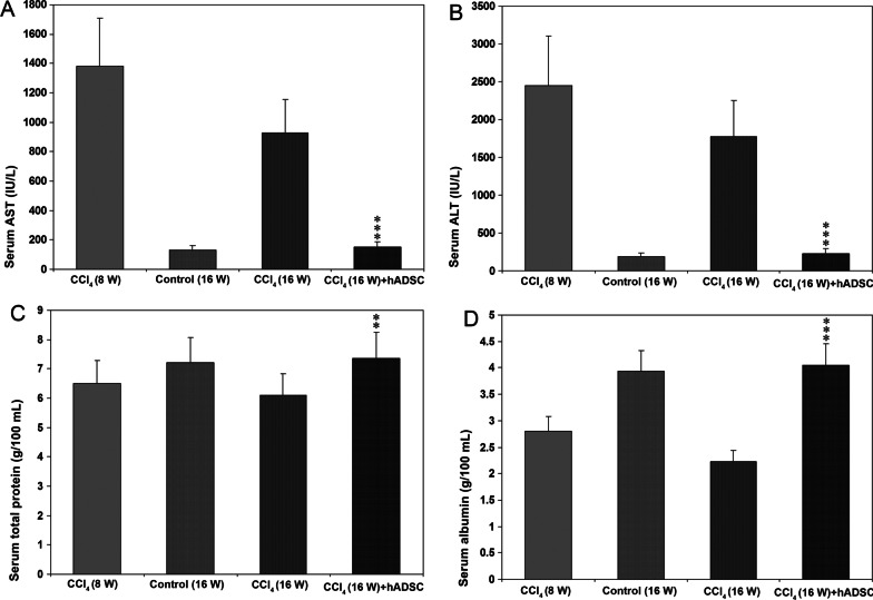 Conclusions: Treatment with hADSCs improved liver functions, markedly reduced hepatic fibrosis and early cirrhosis. Various pleiotropic and paracrine factors secreted from the hADSCs seem to serve as reparative functions in the attenuation of liver cirrhosis. The data demonstrated that treatment with hADSCs can be successfully used as a potent therapeutic method to prevent progression of hepatic fibrosis and related adverse events.