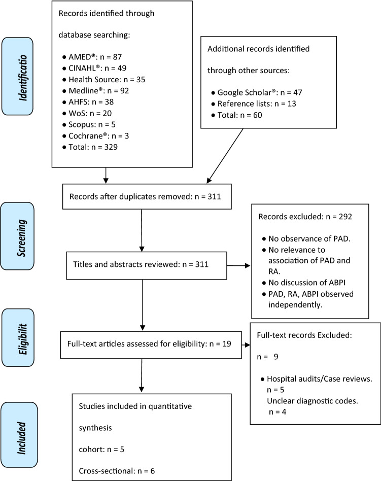 Patients with rheumatoid arthritis (RA) are at an increased risk of cardiovascular disease and vascular morbidity. The association between peripheral arterial disease (PAD) and RA has not been previously investigated within the scope of a review. Conjoined disease manifestations may impact patient well-being, perpetuating increased mortality and quality of life deficits. To investigate the association between RA and PAD, along with RA and the ankle-brachial pressure index (ABPI), the impact of disease concomitance on health-related quality of life (HRQOL) and functional capacity (FC) was also investigated. Individual study appraisal was completed using the Crowe Critical Appraisal Tool (CCAT). A level of evidence analysis was conducted using the American Society of Plastic Surgeons (ASPS) Evidence Rating Scale for Prognostic/Risk Studies. AMED®, CINAHL®, Health Source: Nursing/Academic Edition, MEDLINE®, AHFS®, Scopus, Web of Science, Cochrane Library and Google scholar. Ten studies produced a CCAT rating of ≥ 30 (75%) and were deemed high quality, while a single study demonstrated a score of 26 (65%) suggesting moderate quality. A grade "II" levels of evidence was awarded to positive association between RA and PAD. A gradation of "I" was awarded to the association between ABPI and RA. The impact of concomitant manifestations on HRQOL and FC did not qualify for a level of evidence analysis. The systematic inflammatory nature of RA likely contributes to the increased incidence of PAD within the population. Further investigations are required to ascertain the impact of conjoined disease manifestations on HRQOL and FC.