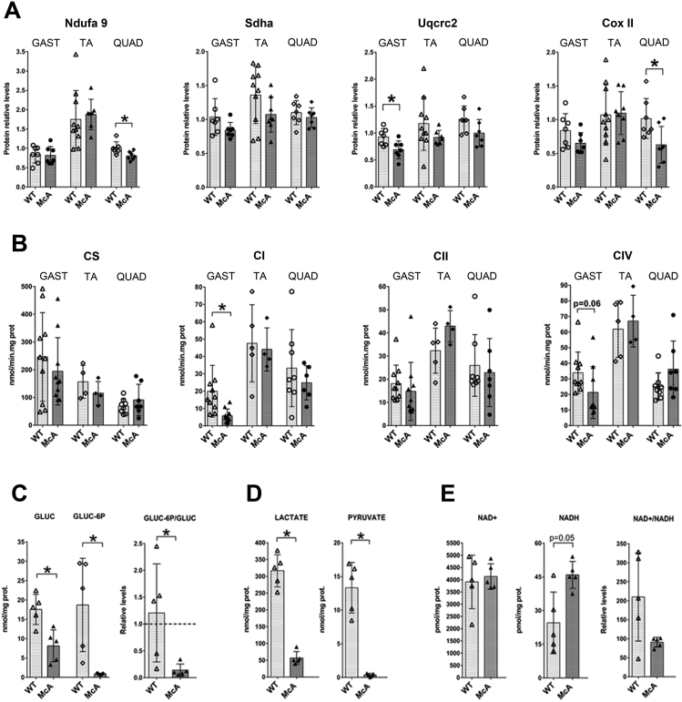 Results: Besides corroborating very poor VO2peak values in patients and impairment in muscle glycolytic flux, we found that, in McArdle muscle: (a) damaged fibers are likely those with a higher mitochondrial and glycogen content, which show major disruption of the three main cytoskeleton components-actin microfilaments, microtubules and intermediate filaments-thereby contributing to mitochondrial network disruption in skeletal muscle fibers; (b) there was an altered subcellular localization of mitochondrial fission/fusion proteins and of the sarcoplasmic reticulum protein calsequestrin-with subsequent alteration in mitochondrial dynamics/function; impairment in mitochondrial content/biogenesis; and (c) several OXPHOS-related complex proteins/activities were also affected.