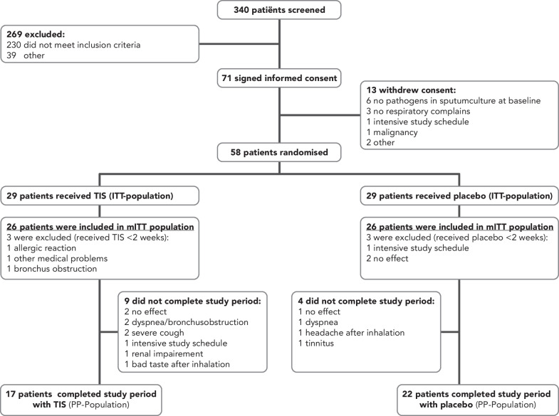 Materials/patients: IN THIS MULTICENTER RCT PATIENTS AGED ≥ 18-YEAR-OLD WERE INCLUDED WITH CONFIRMED BRONCHIECTASIS AND ≥ 2 EXACERBATIONS IN THE PRECEDING YEAR. PATIENTS WERE ASSIGNED (1:1) TO RECEIVE TIS OR PLACEBO OD FOR 1-YEAR.: RESULTS: 58 patients were included of which 52 were analyzed in the mITT analysis. TIS reduced exacerbation frequency with a RR of 0.74 (95% CI 0.49-1.14) (p = 0.15). Within the TIS population a decrease in number of exacerbations was found (2; p = 0.00), which was also seen in the placebo-treated patients (1.5; p = 0.00). In the TIS-treated patients the QoL improved (LRTI-VAS p = 0.02 Leicester Cough p = 0.02) without additional safety concerns. No differences were found for the other secondary outcomes.