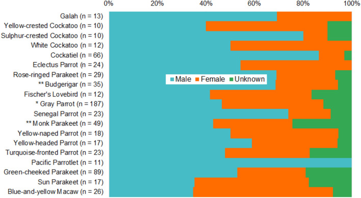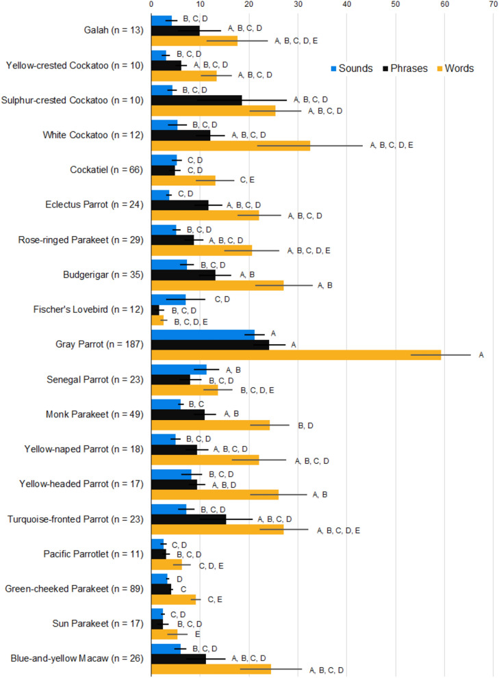 Parrots are one of the rare animal taxa with life-long vocal learning. Parrot vocal repertoires are difficult to study in the wild, but companion parrots offer a valuable data source. We surveyed the public about mimicry repertoires in companion parrots to determine whether vocal learning varied by (1) species, (2) sex, (3) age, and (4) social interaction with other parrots. Species differed significantly in mimicry ability, with grey parrots (Psittacus erithacus) having the largest mimicry repertoires. Analyses of all birds (n = 877) found no overarching effects of sex, age, or parrot-parrot social interactions on mimicry repertoires. Follow up analyses (n = 671), however, revealed a human bias to assume that talking parrots are male, and indicated that five of the 19 best-sampled species exhibited sex differences. Age-specific analyses of grey parrots (n = 187) indicated that repertoire size did not increase during adulthood. Most parrots were capable of improvisation (e.g. rearranging words) and used mimicry in appropriate human contexts. Results indicate that parrot vocal production learning varies among and within species, suggesting that the mechanisms and functions of learning also vary. Our data provide a rich foundation for future comparative research on avian vocalizations, and broaden our understanding of the underpinnings of communicative behavior and learning across all animals.