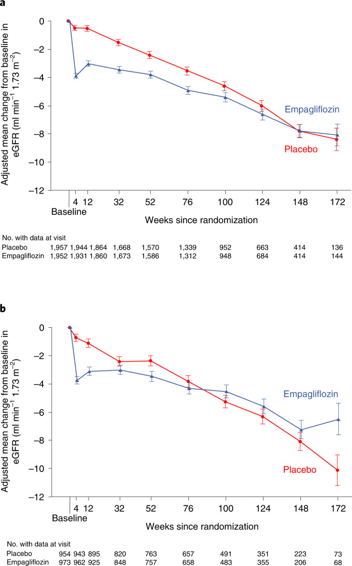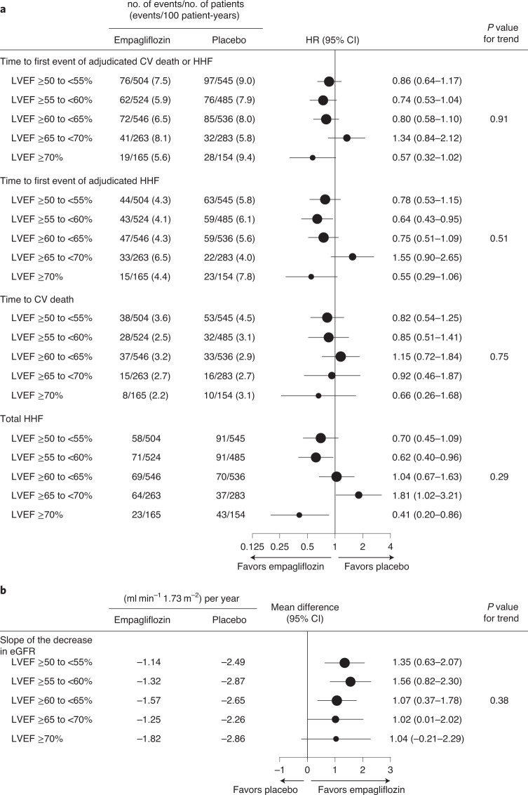 The EMPEROR-Preserved trial showed that the sodium-glucose co-transporter 2 inhibitor empagliflozin significantly reduces the risk of cardiovascular death or hospitalization for heart failure (HHF) in heart failure patients with left ventricular ejection fraction (LVEF) > 40%. Here, we report the results of a pre-specified analysis that separately evaluates these patients stratified by LVEF: preserved (≥ 50%) (n = 4,005; 66.9%) or mid-range (41-49%). In patients with LVEF ≥ 50%, empagliflozin reduced the risk of cardiovascular death or HHF (the primary endpoint) by 17% versus placebo (hazard ratio (HR) 0.83; 95% confidence interval (CI): 0.71-0.98, P = 0.024). For the key secondary endpoint, the HR for total HHF was 0.83 (95%CI: 0.66-1.04, P = 0.11). For patients with an LVEF of 41-49%, the HR for empagliflozin versus placebo was 0.71 (95%CI: 0.57-0.88, P = 0.002) for the primary outcome (Pinteraction = 0.27), and 0.57 (95%CI: 0.42-0.79, P < 0.001) for total HHF (Pinteraction = 0.06). These results, together with those from the EMPEROR-Reduced trial in patients with LVEF < 40%, support the use of empagliflozin across the full spectrum of LVEF in heart failure.