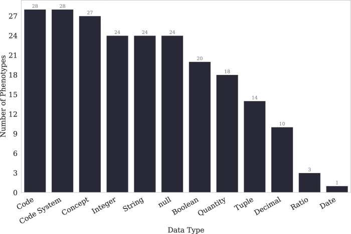 Discussion: Despite the range of conditions, we found that all of the phenotype definitions consisted of logical criteria, representing both clinical and operational logic, and tabular data, consisting of codes from standard terminologies and keywords for natural language processing. The total number and variety of expressions are low, which may be to simplify implementation, or authors may limit complexity due to data availability constraints.