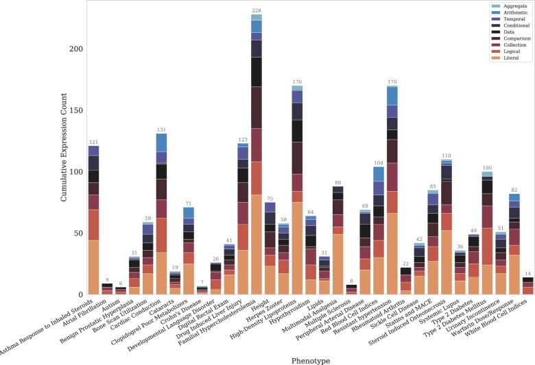 Results: Most of the phenotype definitions include narrative descriptions and flowcharts, while few provide pseudocode or executable artifacts. Most use 4 or fewer medical terminologies. The number of codes used ranges from 5 to 6865, and value sets from 1 to 19. We found that the most common expressions used were literal, data, and logical expressions. Aggregate and arithmetic expressions are the least common. Expression depth ranges from 4 to 27.