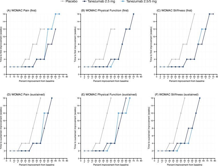 Methods: Post-hoc nonparametric Kaplan-Meier analyses were used to estimate median time to first improvement and to sustained improvement in Western Ontario and McMaster Universities Osteoarthritis Index domain (Pain, Physical Function, Stiffness) scores across a range of improvement thresholds (0-100%, in 5% increments). Time to first improvement was defined as the first week scores met the pre-specified threshold. Time to sustained improvement was defined as the first week scores met the pre-specified threshold and were sustained (on average) for the remainder of the treatment period.