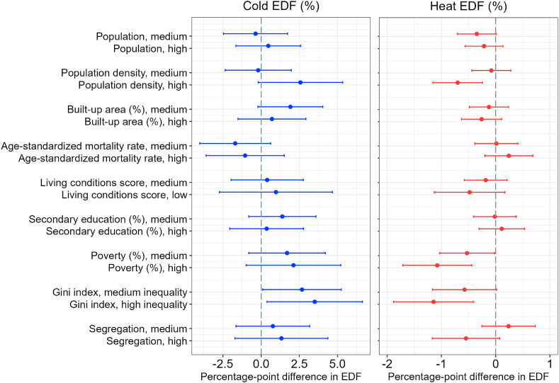 Results: We find limited effect modification of cold-related mortality by city-level demographic and socioeconomic characteristics and several unexpected associations for heat-related mortality. For example, cities in the highest compared to the lowest tertile of income inequality have all-age cold-related excess mortality that is, on average, 3.45 percentage points higher (95% CI: 0.33, 6.56). Higher poverty and higher segregation were also associated with higher cold EDF among those 65 and older. Large, densely populated cities, and cities with high levels of poverty and income inequality experience smaller heat EDFs compared to smaller and less densely populated cities, and cities with little poverty and income inequality.