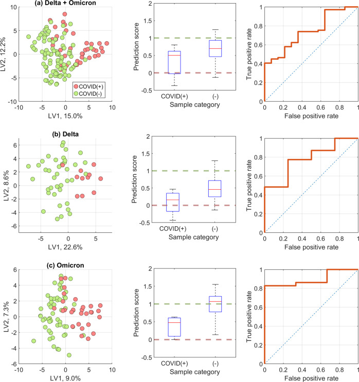 Results: Here we show that based on 63 exhaled compounds, a general COVID-19 model had an accuracy of 0.73 ± 0.06, which improved to 0.82 ± 0.12 when modeling only the Delta wave, and 0.84 ± 0.06 for the Omicron wave. The specificity improved for the Delta and Omicron models (0.79 ± 0.21 and 0.74 ± 0.12, respectively) relative to the general model (0.61 ± 0.13).
