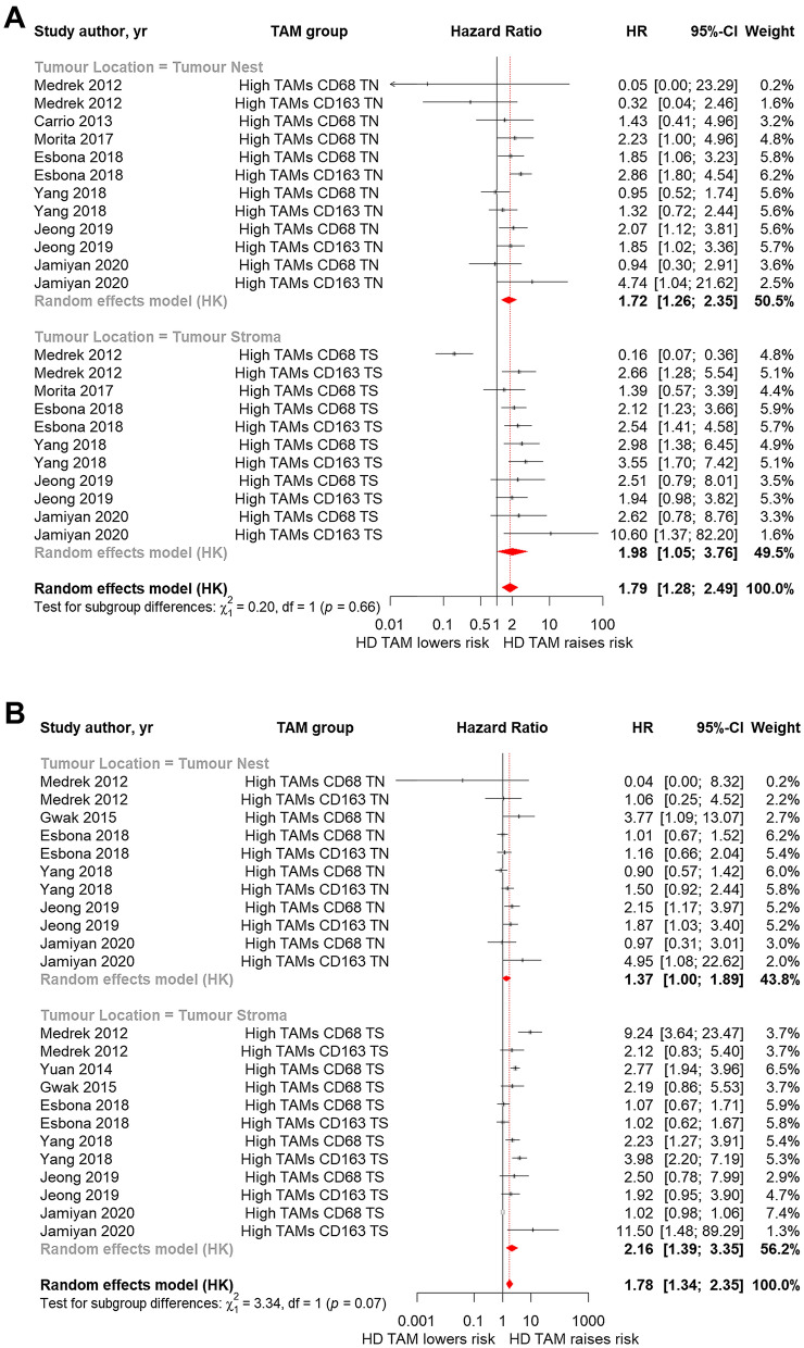 Methods: We performed a systematic literature search of trials (from 1900 to August 2020) reporting overall survival (OS) or progression-free survival (PFS), breast cancer-specific survival (BCSS), TAM phenotype, and density. Thirty-two studies with 8446 patients were included. Meta-analyses were carried out on hazard ratios (HRs) for survival outcomes of breast cancer patients with a high density of TAMs (CD68+ and/or CD163+) compared to a low density of TAMs.