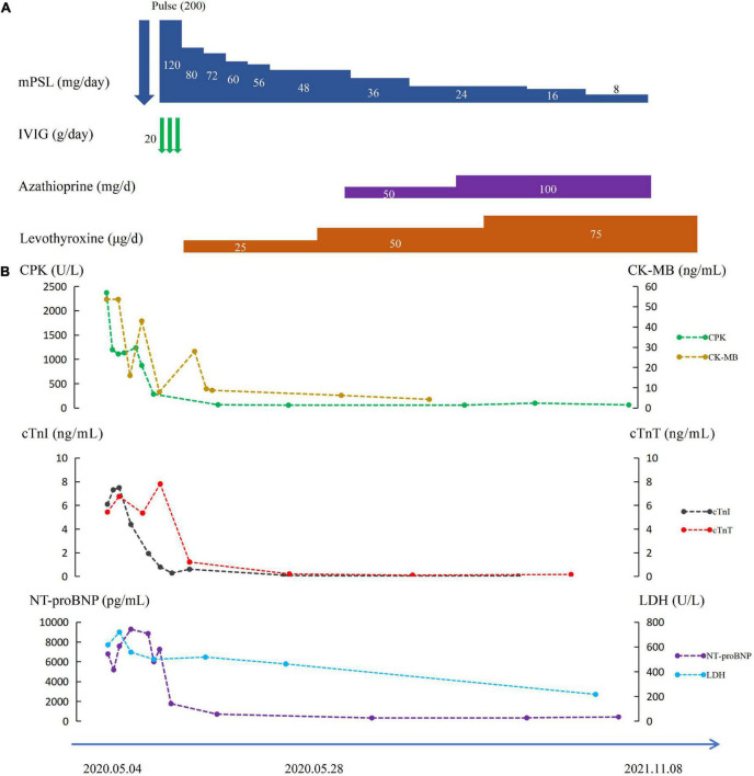 Immune checkpoint inhibitors (ICIs) have significantly improved the survival of patients with advanced tumors. However, immune-related adverse events (irAEs) caused by ICIs, especially high-grade irAEs, are of growing concern. High-grade multisystem irAEs due to toripalimab, a programmed cell death-1 (PD-1) inhibitor, have been rarely reported. Two patients with malignant metastatic tumors were treated with anti-PD-1 immunotherapy. However, both patients developed high-grade multisystem irAEs based on myocarditis, with chest discomfort and malaise as the main clinical manifestation. Both patients had an elevation of cardiac enzymes, abnormal electrocardiography and left ventricular wall motion. Patient 2 was also diagnosed with organizing pneumonia. Immunotherapy was suspended. High-dose intravenous methylprednisolone was immediately initiated. The patients' symptoms were significantly relieved in a short period of time. Immunosuppressants were discontinued at the 6th month follow-up in patient 1 without relapse. However, patient 2 was lost to follow up due to financial reasons. To the best of our knowledge, this is the first report regarding ICI-associated myocarditis-pneumonia due to toripalimab, indicating the significance of early recognition and management of high-grade multisystem irAEs in clinical practice.