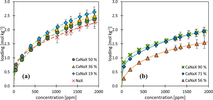 During the conversion of natural gas to liquified natural gas, sulfur components are separated by adsorption on zeolites. New zeolite materials may improve this adsorption process. In this paper, the adsorption of hydrogen sulfide is studied on seven faujasite (FAU) zeolites, which differ only in the number of sodium and calcium cations. From a pure NaX zeolite (13X), which contains only sodium cations, the calcium cation content was gradually increased by ion exchange. In a fixed-bed adsorber, cumulative equilibrium loadings of H2S on these zeolites were determined at concentrations between 50 and 2000 ppm at 25 and 85 °C and 1.3 bar (abs). Adsorption isotherms were analyzed considering the influence of cation positioning in the FAU zeolites. The experimental data indicate a superposition of a chemisorptive and a physisorptive mechanism. At a small number of chemisorptive sites, we conclude a dissociation of hydrogen sulfide and covalent bonding of the proton and the hydrogen sulfide ion to the zeolite lattice. The contribution of chemisorption exhibits a very low temperature dependence, which is typical for nearly irreversible reactions with an equilibrium strongly shifted to one side. With an increase in the proportion of Ca2+ cations, only physisorptive adsorption by electrostatic interaction with the cations in the lattice was observed. A large number of physisorptive sites have a lower energetic value. The share of physisorption strongly depends on temperature, which is characteristic of reversible equilibrium reactions.
