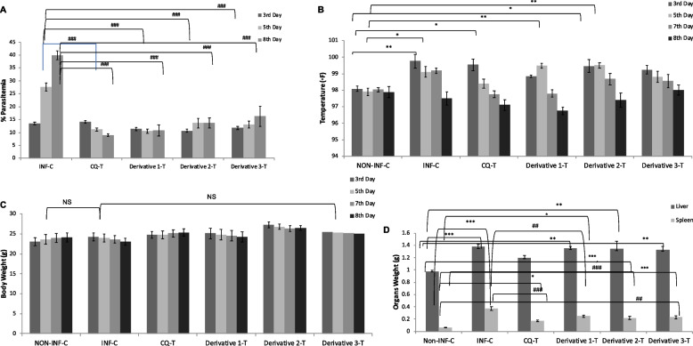 Methods: BALB/c mice were infected with P. berghei NK-65. The efficacy of the three most potent chalcone derivations (1, 2, and 3) identified after an in vitro compound screening test was tested. The selected doses of 10 mg/kg, 20 mg/kg, and 10 mg/kg were studied by evaluating parasitemia, changes in temperature, body weights, organ weights, histopathological features, nitric oxide, cytokines, and ICAM-1 expression. Also, localization of parasites inside the two vital tissues involved during malaria infections was done through a transmission electron microscope.