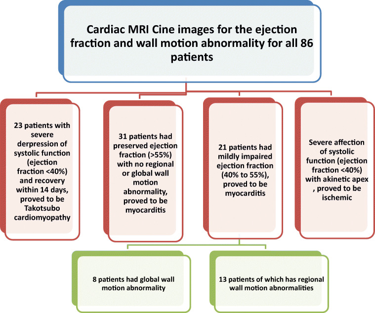 Methods: This descriptive retrospective study included 86 cases, with a history of COVID-19 infection confirmed by positive RT-PCR, who met the inclusion criteria. Patients had progressive chest pain or dyspnoea with a suspected underlying cardiac cause, either by an abnormal electrocardiogram or elevated troponin levels. Cardiac MRI was performed with late contrast-enhanced (LGE) imaging, followed by T1 and T2 mapping.