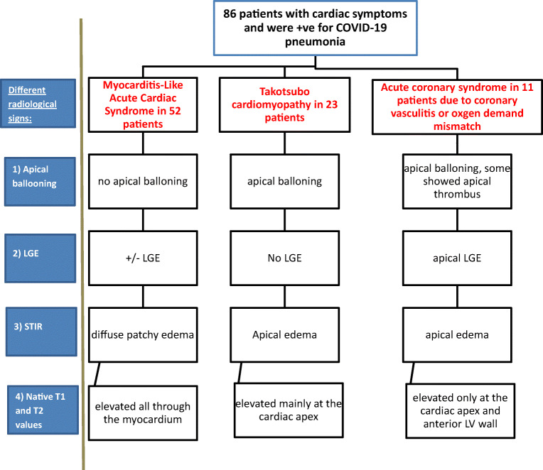 Conclusion: Different COVID-19-related cardiac injuries may cause similar clinical symptoms. Cardiac MRI is the modality of choice to differentiate between the different types of myocardial injury such as Takotsubo cardiomyopathy and infection-related cardiomyopathy or even acute coronary syndrome secondary to vasculitis or oxygen-demand mismatch.