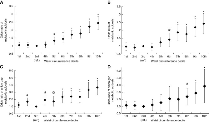 Results: Greater WC and MetS features were associated with progressively lower bicarbonate, higher anion gap, and greater odds ratios (OR) of metabolic acidosis (MA) and anion gap metabolic acidosis (AGMA). Compared with the reference, participants with the highest WC had ORs for MA and AGMA of 2.26; 95% CI, 1.96 to 2.62 and 2.89; 95% CI, 1.97 to 4.21; those with three and four versus zero MetS features had ORs for AGMA of 2.52; 95% CI, 1.95 to 2.94 and 3.05; 95% CI, 2.16 to 3.82. Associations of body mass index with outcomes were attenuated or absent after adjustment for WC or MetS. Findings were preserved after excluding eGFR <90 ml/min per 1.73 m2 and albuminuria. A lower MA cutoff (<22 mEq/L) raised the estimate of association between MetS and MA (OR for three and four vs zero features: 3.56; 95% CI, 2.53 to 5.02 and 5.44; 95% CI, 3.66 to 8.08).