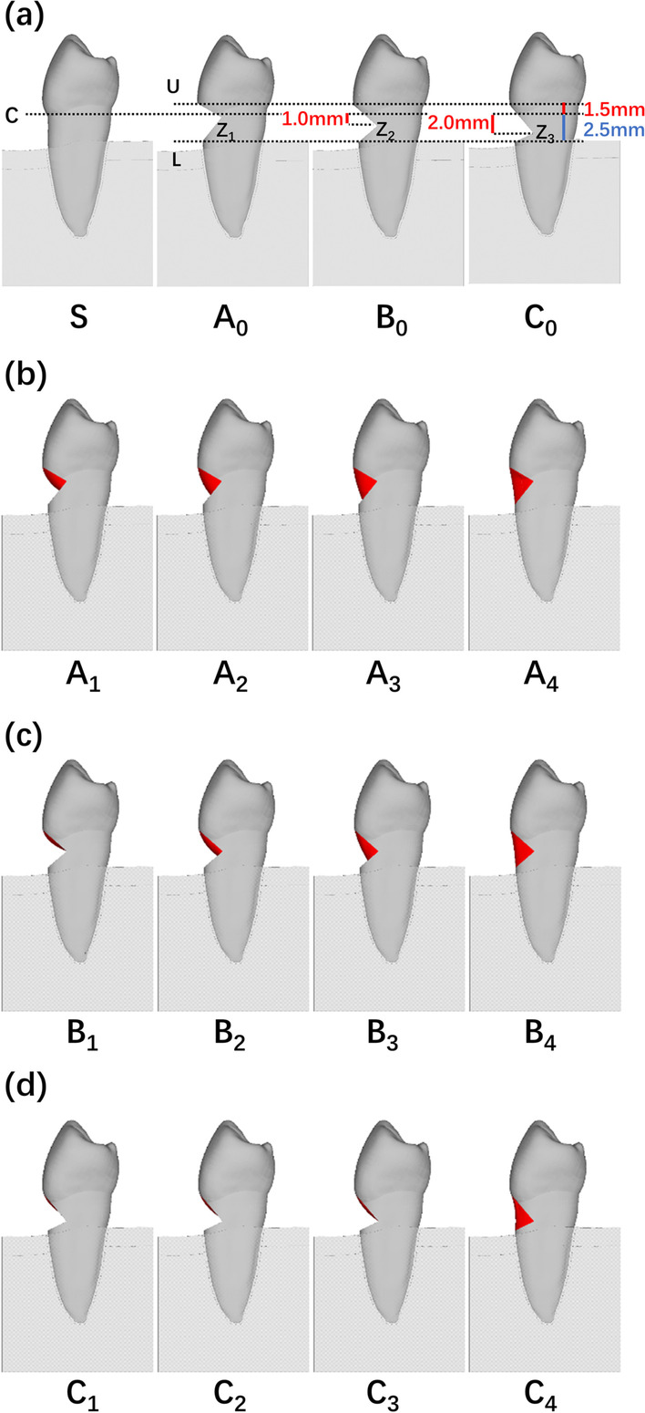 Methods: Three-dimensional finite element models of buccal wedge-shaped NCCLs in various locations of a defected zenith (0 mm, 1 mm, and 2 mm) were constructed and divided into three groups (A, B, and C). Three partially restored NCCL models with different locations of the lower restoration border (1 mm, 1.5 mm, and 2 mm), and one completely restored NCCL model were further constructed for each group. The following restorative materials were used in all restoration models: composite resin (CR), glass-ionomer cement (GIC), and mineral trioxide aggregate (MTA). The first principal stress distributions under buccal oblique loads of 100 N were analyzed. Restoration bond failures were also evaluated based on stress distributions at dentin-restoration interfaces.