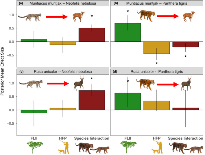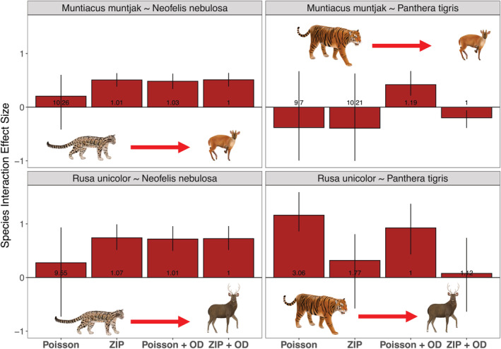 Predator-prey dynamics are a fundamental part of ecology, but directly studying interactions has proven difficult. The proliferation of camera trapping has enabled the collection of large datasets on wildlife, but researchers face hurdles inferring interactions from observational data. Recent advances in hierarchical co-abundance models infer species interactions while accounting for two species' detection probabilities, shared responses to environmental covariates, and propagate uncertainty throughout the entire modeling process. However, current approaches remain unsuitable for interacting species whose natural densities differ by an order of magnitude and have contrasting detection probabilities, such as predator-prey interactions, which introduce zero inflation and overdispersion in count histories. Here, we developed a Bayesian hierarchical N-mixture co-abundance model that is suitable for inferring predator-prey interactions. We accounted for excessive zeros in count histories using an informed zero-inflated Poisson distribution in the abundance formula and accounted for overdispersion in count histories by including a random effect per sampling unit and sampling occasion in the detection probability formula. We demonstrate that models with these modifications outperform alternative approaches, improve model goodness-of-fit, and overcome parameter convergence failures. We highlight its utility using 20 camera trapping datasets from 10 tropical forest landscapes in Southeast Asia and estimate four predator-prey relationships between tigers, clouded leopards, and muntjac and sambar deer. Tigers had a negative effect on muntjac abundance, providing support for top-down regulation, while clouded leopards had a positive effect on muntjac and sambar deer, likely driven by shared responses to unmodelled covariates like hunting. This Bayesian co-abundance modeling approach to quantify predator-prey relationships is widely applicable across species, ecosystems, and sampling approaches and may be useful in forecasting cascading impacts following widespread predator declines. Taken together, this approach facilitates a nuanced and mechanistic understanding of food-web ecology.