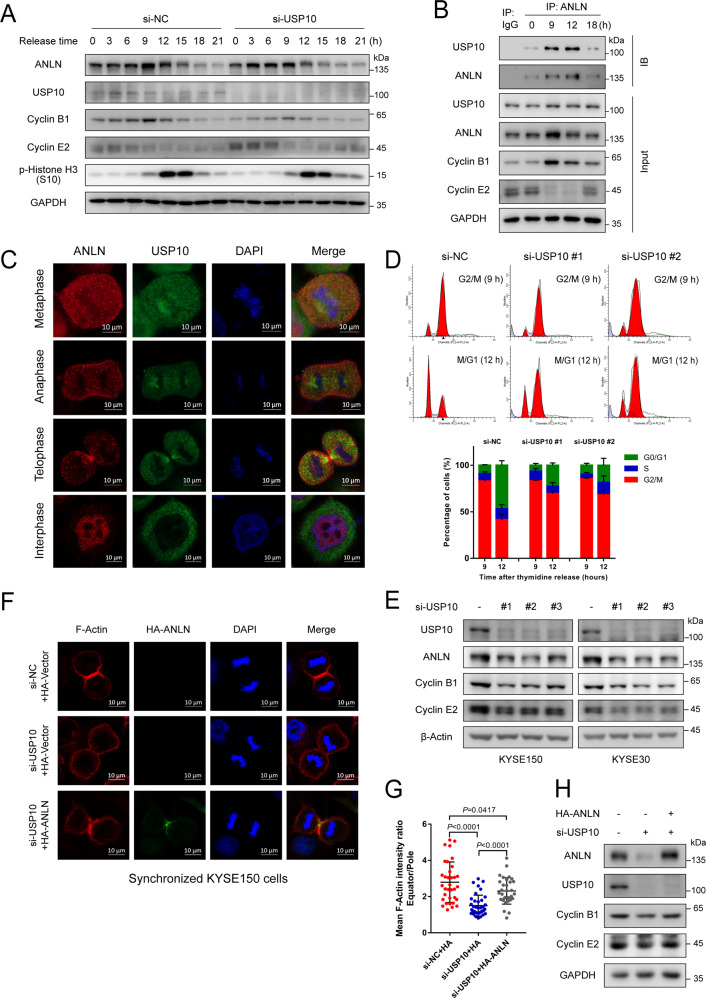 Anillin (ANLN) is a mitosis-related protein that promotes contractile ring formation and cytokinesis, but its cell cycle-dependent degradation mechanisms in cancer cells remain unclear. Here, we show that high expression of ANLN promotes cytokinesis and proliferation in esophageal squamous cell carcinoma (ESCC) cells and is associated with poor prognosis in ESCC patients. Furthermore, the findings of the study showed that the deubiquitinating enzyme USP10 interacts with ANLN and positively regulates ANLN protein levels. USP10 removes the K11- and K63-linked ubiquitin chains of ANLN through its deubiquitinase activity and prevents ANLN ubiquitin-mediated degradation. Importantly, USP10 promotes contractile ring assembly at the cytokinetic furrow as well as cytokinesis by stabilizing ANLN. Interestingly, USP10 and the E3 ubiquitin ligase APC/C co-activator Cdh1 formed a functional complex with ANLN in a non-competitive manner to balance ANLN protein levels. In addition, the macrolide compound FW-04-806 (F806), a natural compound with potential for treating ESCC, inhibited the mitosis of ESCC cells by targeting USP10 and promoting ANLN degradation. F806 selectively targeted USP10 and inhibited its catalytic activity but did not affect the binding of Cdh1 to ANLN and alters the balance of the USP10-Cdh1-ANLN complex. Additionally, USP10 expression was positively correlated with ANLN level and poor prognosis of ESCC patients. Overall, targeting the USP10-ANLN axis can effectively inhibit ESCC cell-cycle progression.