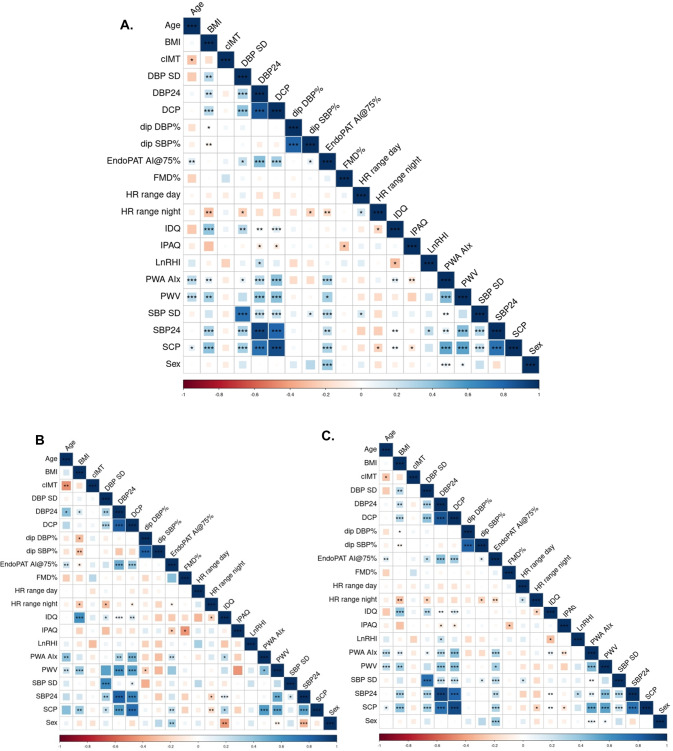 The study characterises vascular phenotypes of hypertensive patients utilising machine learning approaches. Newly diagnosed and treatment-naïve primary hypertensive patients without co-morbidities (aged 18-55, n = 73), and matched normotensive controls (n = 79) were recruited (NCT04015635). Blood pressure (BP) and BP variability were determined using 24 h ambulatory monitoring. Vascular phenotyping included SphygmoCor® measurement of pulse wave velocity (PWV), pulse wave analysis-derived augmentation index (PWA-AIx), and central BP; EndoPAT™-2000® provided reactive hyperaemia index (LnRHI) and augmentation index adjusted to heart rate of 75bpm. Ultrasound was used to analyse flow mediated dilatation and carotid intima-media thickness (CIMT). In addition to standard statistical methods to compare normotensive and hypertensive groups, machine learning techniques including biclustering explored hypertensive phenotypic subgroups. We report that arterial stiffness (PWV, PWA-AIx, EndoPAT-2000-derived AI@75) and central pressures were greater in incident hypertension than normotension. Endothelial function, percent nocturnal dip, and CIMT did not differ between groups. The vascular phenotype of white-coat hypertension imitated sustained hypertension with elevated arterial stiffness and central pressure; masked hypertension demonstrating values similar to normotension. Machine learning revealed three distinct hypertension clusters, representing 'arterially stiffened', 'vaso-protected', and 'non-dipper' patients. Key clustering features were nocturnal- and central-BP, percent dipping, and arterial stiffness measures. We conclude that untreated patients with primary hypertension demonstrate early arterial stiffening rather than endothelial dysfunction or CIMT alterations. Phenotypic heterogeneity in nocturnal and central BP, percent dipping, and arterial stiffness observed early in the course of disease may have implications for risk stratification.
