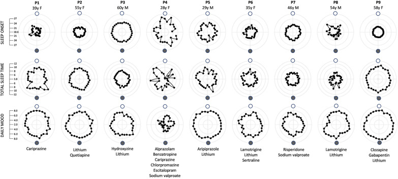 Circular plots of the average sleep onset time (clock time), total sleep time (hours), and daily mood ratings (1-worst mood to 10-best mood) for each participant, averaged across all available months relative to the lunar illuminance cycle. The full moon is shown as a white circle and the new moon as a gray circle. Each participant’s age and sex are listed at the top, with medications they were taking during the study listed below. Missing sleep data for P4 reflects this participant skipping sleep one night