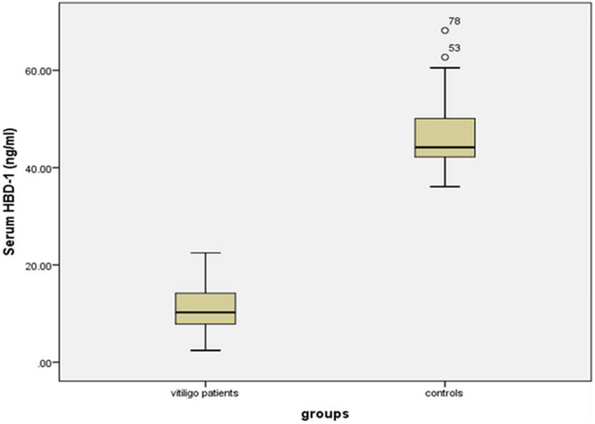 Methods: A current case-control study included 50 patients having NSV and 50 controls. The authors used Vitiligo Area Scoring Index (VASI) score to assess vitiligo severity and laboratory investigations to assess serum HBD-1 level using ELISA and defensin-beta1 (DEFB1) SNP using polymerase chain reaction-restriction fragment length polymorphism (PCR-RFLP).
