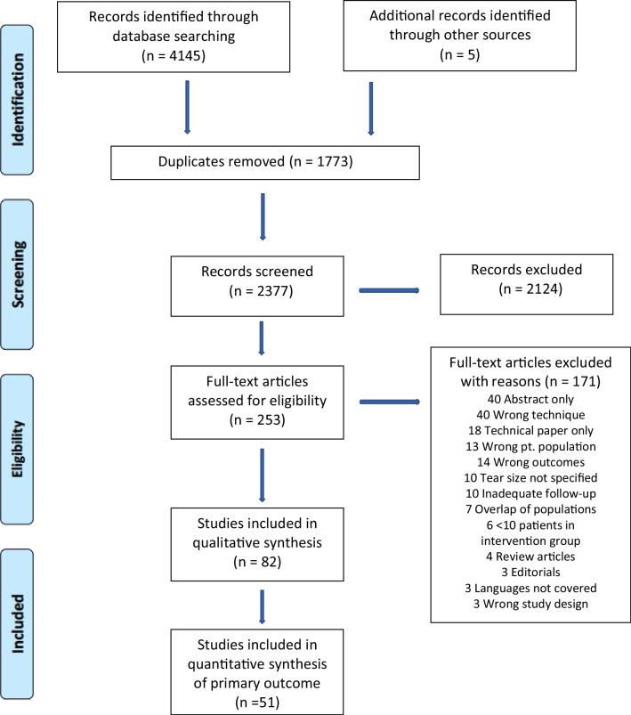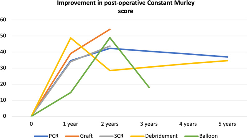 Results: Eighty-two studies were included reporting the outcomes of 2790 shoulders. Fifty-one studies were included in the meta-analysis of the primary outcome. The definition of an irreparable tear varied. All procedures resulted in improved shoulder scores at early follow-up. Shoulder scores declined after 2 years following balloon spacers, arthroscopic debridement and partial cuff repair. High retear rates were seen with partial cuff repairs (45%), graft interposition (21%) and superior capsule reconstruction (21%).