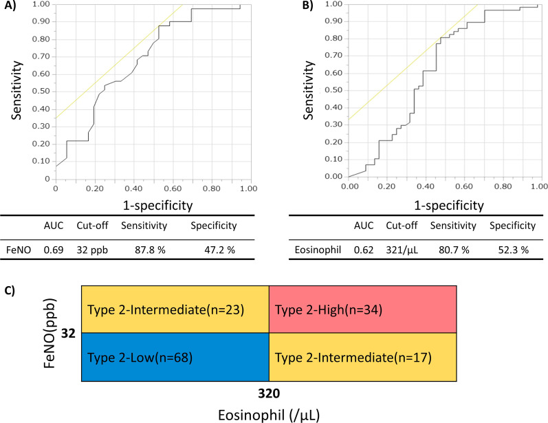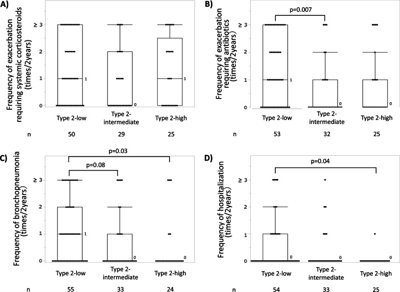 Results: In total, 216 cases from 81 facilities were reported, and 142 were stratified: 34, 40 and 68 into the type 2-high, -intermediate and -low groups, respectively. The frequency of bronchopneumonia and exacerbations requiring antibiotics and gram-negative bacteria detection rates were highest in the type 2-low group. Eighty-seven cases had paired latest and oldest available data of FeNO and eosinophil counts; they were analysed for inflammatory transition patterns. Among former type 2-high and -intermediate groups, 32% had recently transitioned to the -low group, to which relatively low FeNO in the past and oral corticosteroid use contributed. Lastly, in cases treated with moderate to high doses of inhaled corticosteroids, the frequencies of exacerbations requiring antibiotics were found to be higher in cases with more severe airway lesions and lower FeNO.