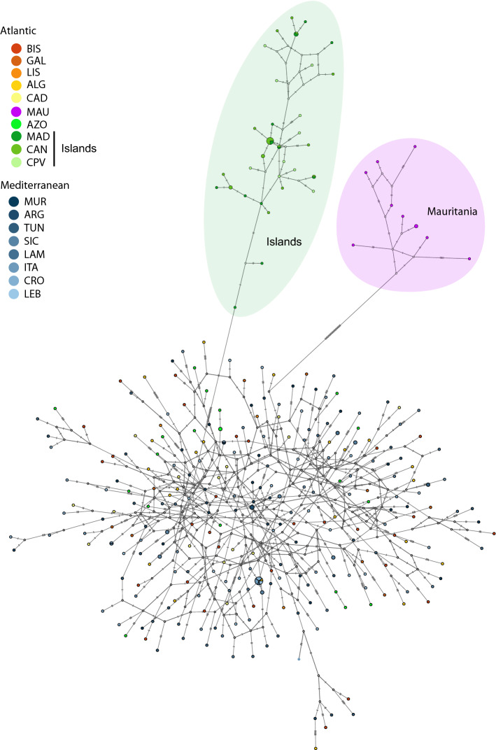 Marine species exhibiting wide distributional ranges are frequently subdivided into discrete genetic units over limited spatial scales. This is often due to specific life-history traits or oceanographic barriers that prevent gene flow. Fine-scale sampling studies revealed distinct phylogeographic patterns in the northeastern Atlantic and the Mediterranean, ranging from panmixia to noticeable population genetic structure. Here, we used mitochondrial sequence data to analyse connectivity in the bogue Boops boops throughout most of its widespread distribution. Our results identified the existence of three clades, one comprising specimens from the Azores and eastern Atlantic/Mediterranean, another with individuals from the Canary Islands, Madeira and Cape Verde archipelagos, and the third with samples from Mauritania only. One of the branches of the northern subtropical gyre (Azores Current) that drifts towards the Gulf of Cádiz promotes a closer connection between the Azores, southern Portugal and the Mediterranean B. boops populations. The Almería-Oran Front, widely recognised as an oceanographic barrier for many organisms to cross the Atlantic-Mediterranean divide, does not seem to affect the dispersal of this benthopelagic species. The southward movement of the Cape Verde Frontal Zone during the winter, combined with the relatively short duration of the pelagic larval stage of B. boops, may be potential factors for preventing the connectivity between the Atlantic oceanic archipelagos and Mauritania shaping the genetic signature of this species.