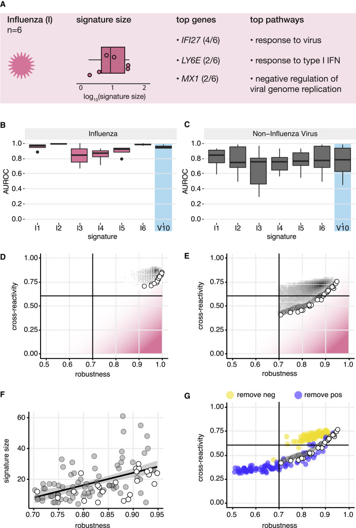 Keywords: aging; bacteria; cross-reactivity; data compendium; infection diagnosis; influenza signature; non-infectious conditions; robustness; signature evaluation framework; transcriptional host response signature; virus.