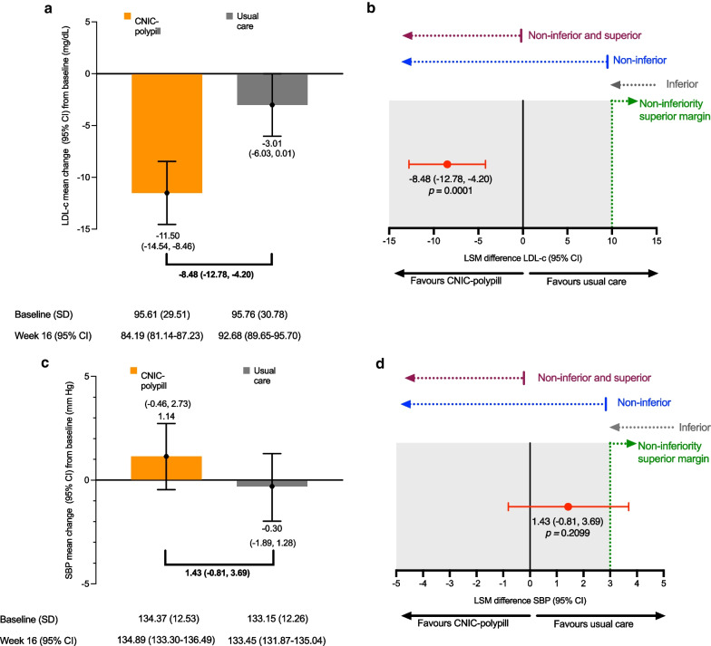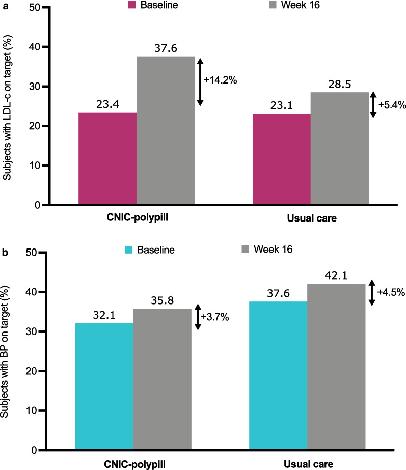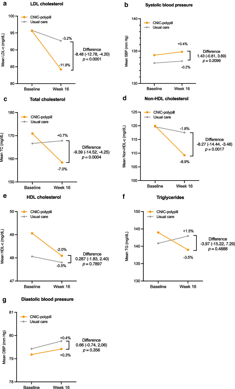 Results: The upper confidence limit of the mean change in LDL-c between treatments was below the prespecified margin (10 mg/dL) and above zero, and non-inferiority and superiority of the CNIC-polypill (p = 0.0001) was reached. There were no significant differences in SBP between groups. However, the upper confidence limit crossed the prespecified non-inferiority margin of 3 mm Hg. Significant differences favoured the CNIC-polypill in reducing total cholesterol (p = 0.0004) and non-high-density lipoprotein cholesterol levels (p = 0.0017). There were no reports of major bleeding episodes. The frequency of non-serious gastrointestinal disorders was more frequent in the CNIC-polypill arm.
