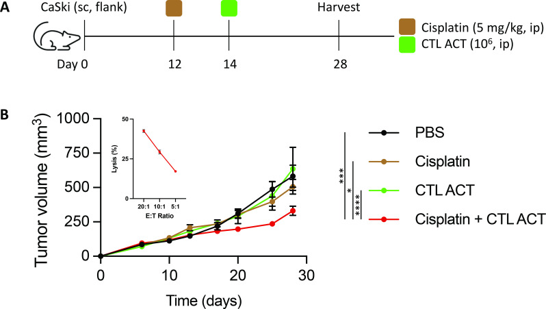 Methods: Retroviral transduction with HPV16 E7 established a novel HPV-associated sinonasal squamous cell carcinoma (SNSCC) cell line. Three established HPV16-positive cell lines were also studied (cervical carcinoma and head and neck squamous cell carcinoma). Following determination of sensitivities to standard therapies using MTT assays, flow cytometry was used to characterize induction of immunogenic cell stress following sublethal exposure to radiation or cisplatin, and the functional consequence of this induction was determined using impedance-based real time cell analysis cytotoxicity assays employing HPV16 E7-specific cytotoxic lymphocytes (CTLs) with or without N803 (IL-15/IL-15-Rα superagonist) or exogenous death receptor ligands. In vitro observations were translated using an in vivo xenograft NSG mouse model of human cervical carcinoma evaluating cisplatin in combination with CTL adoptive cell transfer.