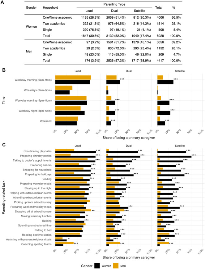 Gender differences in research productivity have been well documented. One frequent explanation of these differences is disproportionate child-related responsibilities for women. However, changing social dynamics around parenting has led to fathers taking an increasingly active role in parenting. This demands a more nuanced approach to understanding the relationship between parenting and productivity for both men and women. To gain insight into associations between parent roles, partner type, research productivity, and research impact, we conducted a global survey that targeted 1.5 million active scientists; we received viable responses from 10,445 parents (< 1% response rate), thus providing a basis for exploratory analyses that shed light on associations between parenting models and research outcomes, across men and women. Results suggest that the gendered effect observed in production may be related by differential engagement in parenting: men who serve in lead roles suffer similar penalties for parenting engagement, but women are more likely to serve in lead roles and to be more engaged across time and tasks, therefore suffering a higher penalty. Taking a period of parental leave is associated with higher levels of productivity; however, the productivity advantage dissipates after six months for the US-sample, and at 12-months for the non-US sample. These results suggest that parental engagement is a more powerful variable to explain gender differences in academic productivity than the mere existence of children, and that policies should factor these labor differentials into account.