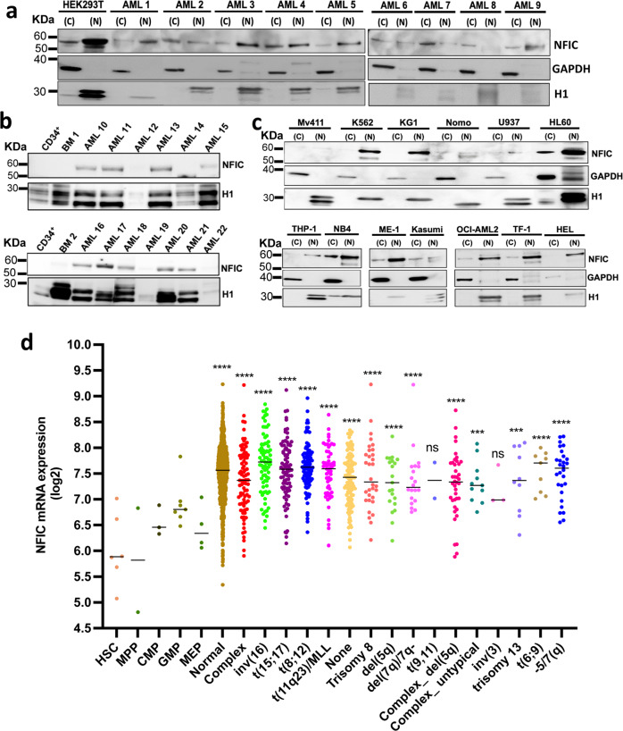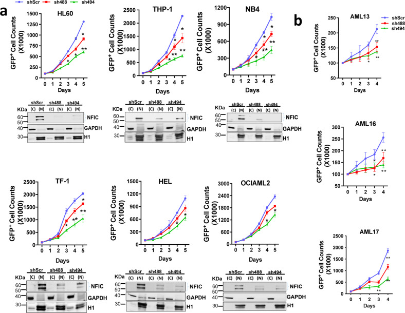 Nuclear factor I-C (NFIC) belongs to a family of NFI transcription factors that binds to DNA through CAATT-boxes and are involved in cellular differentiation and stem cell maintenance. Here we show NFIC protein is significantly overexpressed in 69% of acute myeloid leukemia patients. Examination of the functional consequences of NFIC overexpression in HSPCs showed that this protein promoted monocytic differentiation. Single-cell RNA sequencing analysis further demonstrated that NFIC overexpressing monocytes had increased expression of growth and survival genes. In contrast, depletion of NFIC through shRNA decreased cell growth, increased cell cycle arrest and apoptosis in AML cell lines and AML patient blasts. Further, in AML cell lines (THP-1), bulk RNA sequencing of NFIC knockdown led to downregulation of genes involved in cell survival and oncogenic signaling pathways including mixed lineage leukemia-1 (MLL-1). Lastly, we show that NFIC knockdown in an ex vivo mouse MLL::AF9 pre-leukemic stem cell model, decreased their growth and colony formation and increased expression of myeloid differentiation markers Gr1 and Mac1. Collectively, our results suggest that NFIC is an important transcription factor in myeloid differentiation as well as AML cell survival and is a potential therapeutic target in AML.