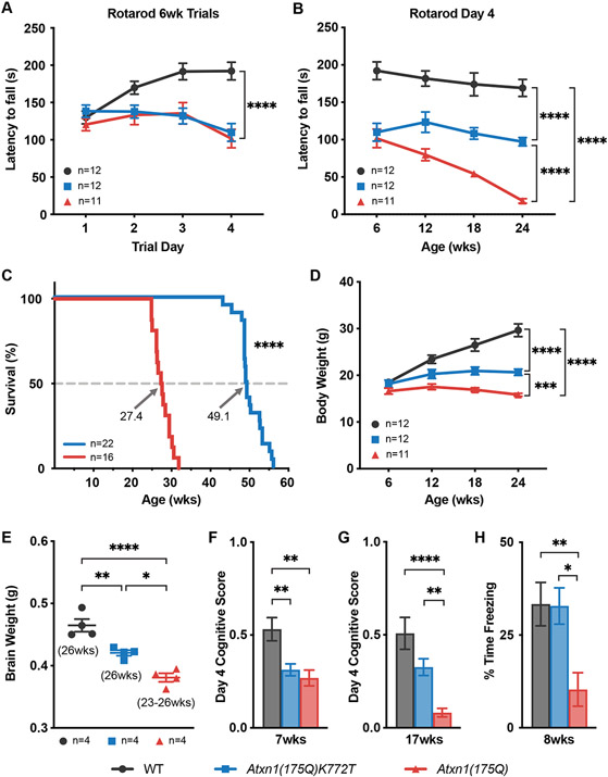 Spinocerebellar ataxia type 1 (SCA1) is a dominant trinucleotide repeat neurodegenerative disease characterized by motor dysfunction, cognitive impairment, and premature death. Degeneration of cerebellar Purkinje cells is a frequent and prominent pathological feature of SCA1. We previously showed that transport of ATXN1 to Purkinje cell nuclei is required for pathology, where mutant ATXN1 alters transcription. To examine the role of ATXN1 nuclear localization broadly in SCA1-like disease pathogenesis, CRISPR-Cas9 was used to develop a mouse with an amino acid alteration (K772T) in the nuclear localization sequence of the expanded ATXN1 protein. Characterization of these mice indicates that proper nuclear localization of mutant ATXN1 contributes to many disease-like phenotypes including motor dysfunction, cognitive deficits, and premature lethality. RNA sequencing analysis of genes with expression corrected to WT levels in Atxn1175QK772T/2Q mice indicates that transcriptomic aspects of SCA1 pathogenesis differ between the cerebellum, brainstem, cerebral cortex, hippocampus, and striatum.