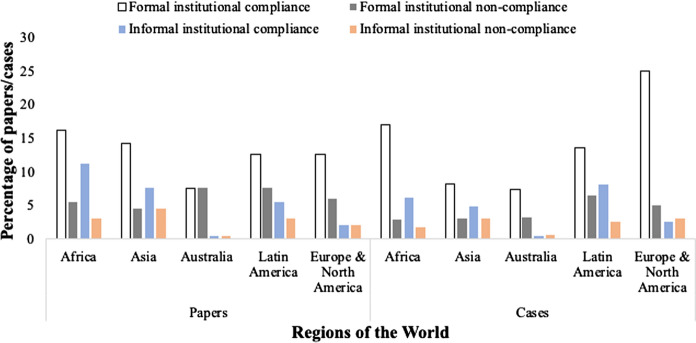 Results: First, FMIs literature is growing; multi-case and multi-country studies characterize Europe/North America, Africa and Latin America, over Asia. Second, the structure-process conceptualization of FMIs predominates in Asia and Africa. Third, global south regions report high cases of compliance with informal FMIs, while non-compliance was registered for Europe/North America in the formal domain. Finally, mixed-methods approaches have been least employed in the studies so far; while the use of only qualitative methods increased over time, the adoption of only quantitative approaches witnessed a decrease.