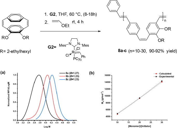 The highly strained ortho-diethylhexyloxy [2.2]paracyclophane-1,9-diene (M1) can be synthesized by ring contraction of a dithia[3.3]paracyclophane using a benzyne-induced Stevens rearrangement. This paracyclophanediene undergoes ring-opening metathesis polymerization to give well-defined 2,3-dialkoxyphenylenevinylene polymers with an alternating cis/trans alkene stereochemistry and controllable molecular weight. Fully conjugated block copolymers with electron-rich and electron-deficient phenylene vinylene polymer segments can be prepared by sequential monomer additions. These polymers can be readily isomerized to the all-trans stereochemistry polymer. The optical and electrochemical properties of these polymers were investigated by theory and experiment.
