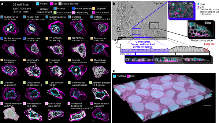 Understanding how a subset of expressed genes dictates cellular phenotype is a considerable challenge owing to the large numbers of molecules involved, their combinatorics and the plethora of cellular behaviours that they determine1,2. Here we reduced this complexity by focusing on cellular organization-a key readout and driver of cell behaviour3,4-at the level of major cellular structures that represent distinct organelles and functional machines, and generated the WTC-11 hiPSC Single-Cell Image Dataset v1, which contains more than 200,000 live cells in 3D, spanning 25 key cellular structures. The scale and quality of this dataset permitted the creation of a generalizable analysis framework to convert raw image data of cells and their structures into dimensionally reduced, quantitative measurements that can be interpreted by humans, and to facilitate data exploration. This framework embraces the vast cell-to-cell variability that is observed within a normal population, facilitates the integration of cell-by-cell structural data and allows quantitative analyses of distinct, separable aspects of organization within and across different cell populations. We found that the integrated intracellular organization of interphase cells was robust to the wide range of variation in cell shape in the population; that the average locations of some structures became polarized in cells at the edges of colonies while maintaining the 'wiring' of their interactions with other structures; and that, by contrast, changes in the location of structures during early mitotic reorganization were accompanied by changes in their wiring.