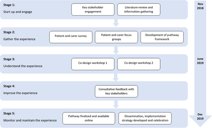 Methods: This study utilised an experienced-based co-design (EBCD) approach over five stages. Stage 1 involved stakeholder engagement and a literature review. Stage 2 included a survey and focus groups with patients/carers. Co-design workshops were conducted within stage 3, key stakeholder consultation within stage 4, and the finalisation and dissemination of the cancer nutrition care pathway formed stage 5. Results of stages 3 to 5 are the focus of this paper.