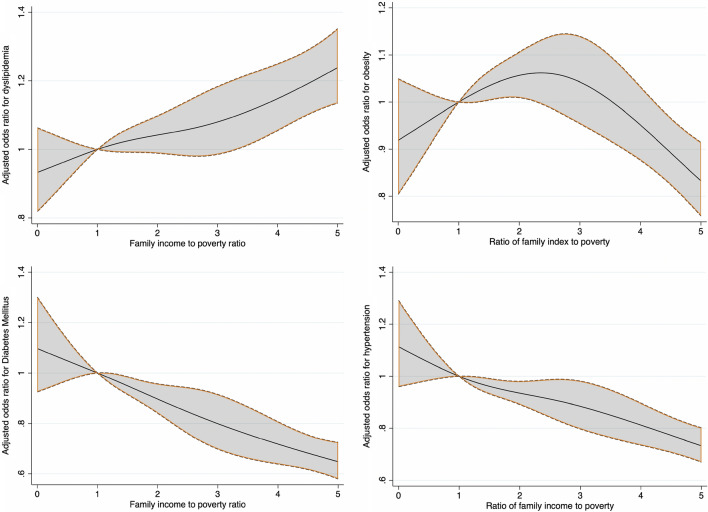 Socioeconomic status is an overlooked risk factor for cardiovascular disease (CVD). Low family income is a measure of socioeconomic status and may portend greater CVD risk. Therefore, we assessed the association of family income with cardiovascular risk factor and disease burden in American adults. This retrospective analysis included data from participants aged ≥ 20 years from the National Health and Nutrition Examination Survey (NHANES) cycles between 2005 and 2018. Family income to poverty ratio (PIR) was calculated by dividing family (or individual) income by poverty guidelines specific to the survey year and used as a measure of socioeconomic status. The association of PIR with the presence of cardiovascular risk factors and CVD as well as cardiac mortality and all-cause mortality was examined. We included 35,932 unweighted participants corresponding to 207,073,472 weighted, nationally representative participants. Participants with lower PIR were often female and more likely to belong to race/ethnic minorities (non-Hispanic Black, Mexican American, other Hispanic). In addition, they were less likely to be married/living with a partner, to attain college graduation or higher, or to have health insurance. In adjusted analyses, the prevalence odds of diabetes mellitus, hypertension, coronary artery disease (CAD), congestive heart failure (CHF), and stroke largely decreased in a step-wise manner from highest (≥ 5) to lowest PIR (< 1). In adjusted analysis, we also noted a mostly dose-dependent association of PIR with the risk of all-cause and cardiac mortality during a mean 5.7 and 5.8 years of follow up, respectively. Our study demonstrates a largely dose-dependent association of PIR with hypertension, diabetes mellitus, CHF, CAD and stroke prevalence as well as incident all-cause mortality and cardiac mortality in a nationally representative sample of American adults. Public policy efforts should be directed to alleviate these disparities to help improve cardiovascular outcomes in vulnerable groups with low family income.