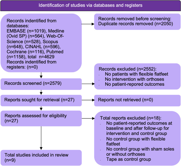 Methods: EMBASE, Medline (OvidSP), Web-of-Science, Scopus, CINAHL, Cochrane Central Register of Controlled Clinical Trials, i.e., Cochrane Central and Pubmed were searched to identify relevant studies since their inception up to February 2021. We included randomized controlled trials (RCT) and prospective studies in which patient reported outcomes at baseline and follow-up in an orthoses group were compared with a no orthoses or sham sole group. Methodological quality of the studies was assessed using the Revised Cochrane risk-of-bias tool for randomized trials (RoB 2) and the Risk Of Bias In Non-Randomized Studies of Interventions (ROBINS-I). A meta-analysis was performed where there were multiple studies with the same outcome measures, which was the case for the Visual Analogue Scale (VAS) for pain in adults.