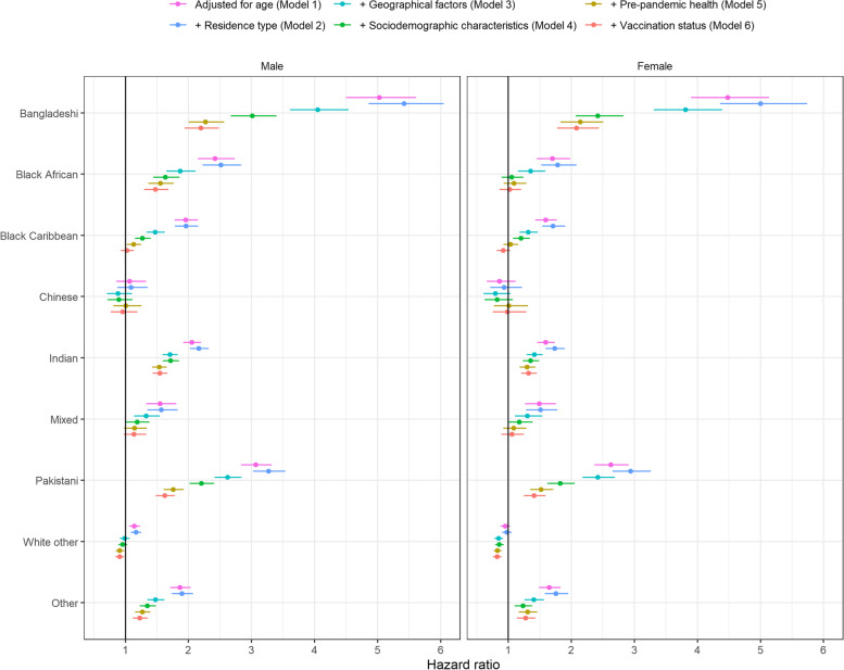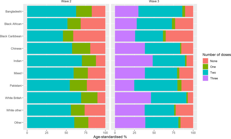 Results: Age-adjusted HRs of death involving COVID-19 were elevated for most ethnic minority groups during both waves, particularly for groups with lowest vaccination rates (Bangladeshi, Pakistani, Black African, and Black Caribbean). HRs were attenuated after adjusting for geographical factors, sociodemographic characteristics, and pre-pandemic health. Further adjusting for vaccination status substantially reduced residual HRs for Black African, Black Caribbean, and Pakistani groups in the third wave. Fully adjusted HRs only remained elevated for the Bangladeshi group (men: 2.19 [95% CI 1.72-2.78]; women: 2.12 [1.58-2.86]) and Pakistani men (1.24 [1.06-1.46]).