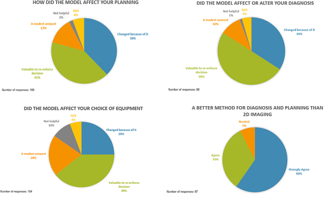 Results: There were 106 models used by 63 surgeons for complex surgical cases between May 2020 and March 2021, across multiple surgical specialties. The models were reported to have benefits in all perioperative areas, with 92.5% of responses agreeing that the 3D model was a better method for diagnosis and planning than traditional 2D techniques. Benefits were reported on preoperative planning (92.4%), economic savings due to equipment selection (54.4%), reduction in surgical time (41.5%) and surgeon-to-surgeon communication (92.6%).