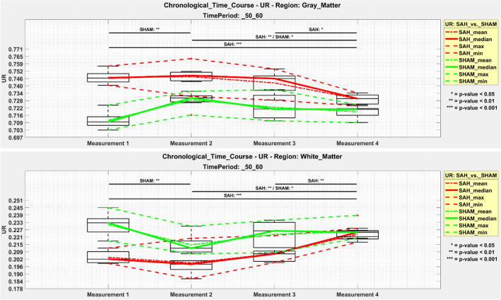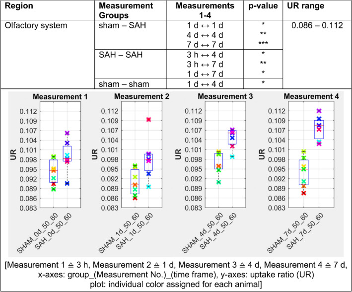 Little is known about changes in brain metabolism following SAH, possibly leading towards secondary brain damage. Despite sustained progress in the last decade, analysis of in vivo acquired data still remains challenging. The present interdisciplinary study uses a semi-automated data analysis tool analyzing imaging data independently from the administrated radiotracer. The uptake of 2-[18F]Fluoro-2-deoxy-glucose ([18F]FDG) was evaluated in different brain regions in 14 male Sprague-Dawley rats, randomized into two groups: (1) SAH induced by the endovascular filament model and (2) sham operated controls. Serial [18F]FDG-PET measurements were carried out. Quantitative image analysis was performed by uptake ratio using a self-developed MRI-template based data analysis tool. SAH animals showed significantly higher [18F]FDG accumulation in gray matter, neocortex and olfactory system as compared to animals of the sham group, while white matter and basal forebrain region showed significant reduced tracer accumulation in SAH animals. All significant metabolic changes were visualized from 3 h, over 24 h (day 1), day 4 and day 7 following SAH/sham operation. This [18F]FDG-PET study provides important insights into glucose metabolism alterations following SAH-for the first time in different brain regions and up to day 7 during course of disease.