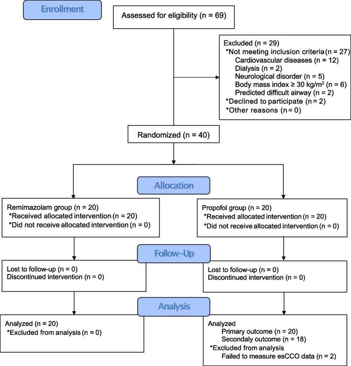 Results: MAP decreased after induction of anesthesia in both groups, without significant differences between the groups (- 41.1 [16.4] mmHg and - 42.8 [10.8] mmHg in remimazolam and propofol groups, respectively; mean difference: 1.7 [95% confidence interval: - 8.2 to 4.9]; p = 0.613). Furthermore, HR, CO, and SV decreased after induction in both groups, without significant differences between the groups. Remimazolam group had significantly shorter time until loss of consciousness than propofol group (1.7 [0.7] min and 3.5 [1.7] min, respectively; p < 0.001). However, MAP, HR, CO, and SV were not significantly different between the groups despite adjusting time until loss of consciousness as a covariate. Seven (35%) and 11 (55%) patients in the remimazolam and propofol groups, respectively, experienced hypotension (MAP < 65 mmHg over 2.5 min), without significant differences between the groups (p = 0.341).