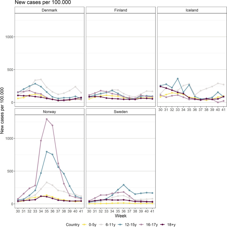 Background: Extensive measures to control spread of SARS-CoV-2 have led to limited access to education for millions of children and adolescents during the COVID-19 pandemic. Education and access to schools is vital for children and adolescents' learning, health, and wellbeing. Based on high vaccine uptake and low incidence levels, the Nordic countries (Denmark, Finland, Iceland, Norway and Sweden) decided to start the academic year 2021/22 with schools open for in-person teaching and moderate mitigation measures. We describe trends in SARS-CoV-2 infections and vaccination coverage among students during the first 12 weeks of the fall semester.