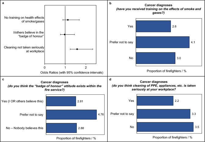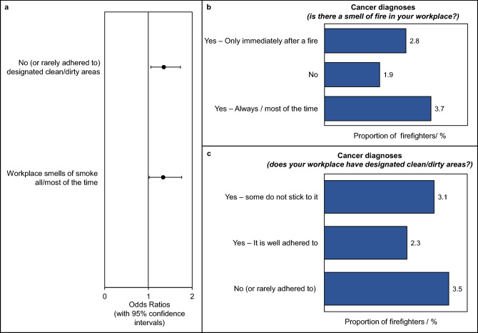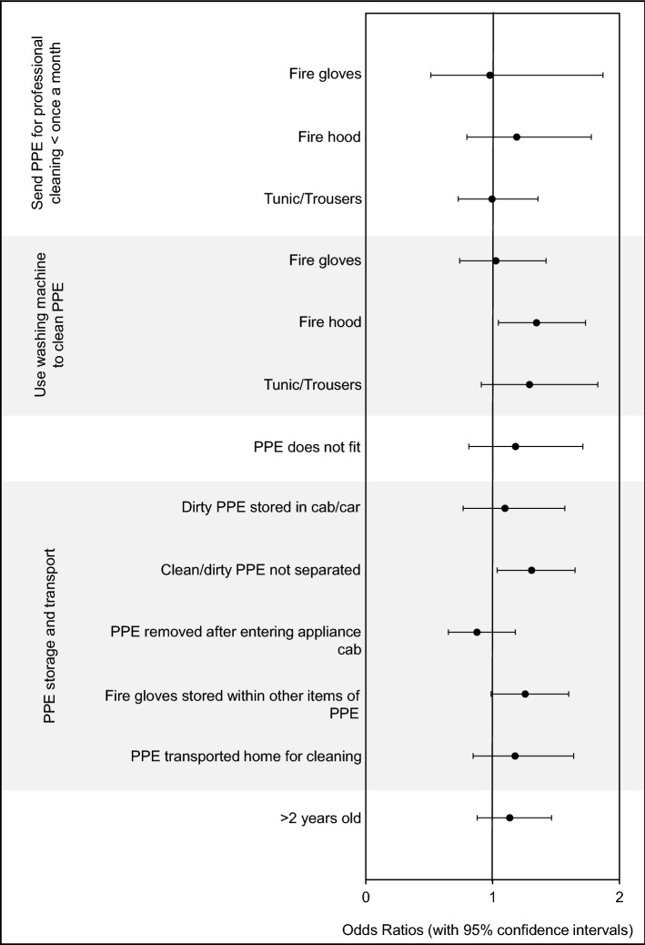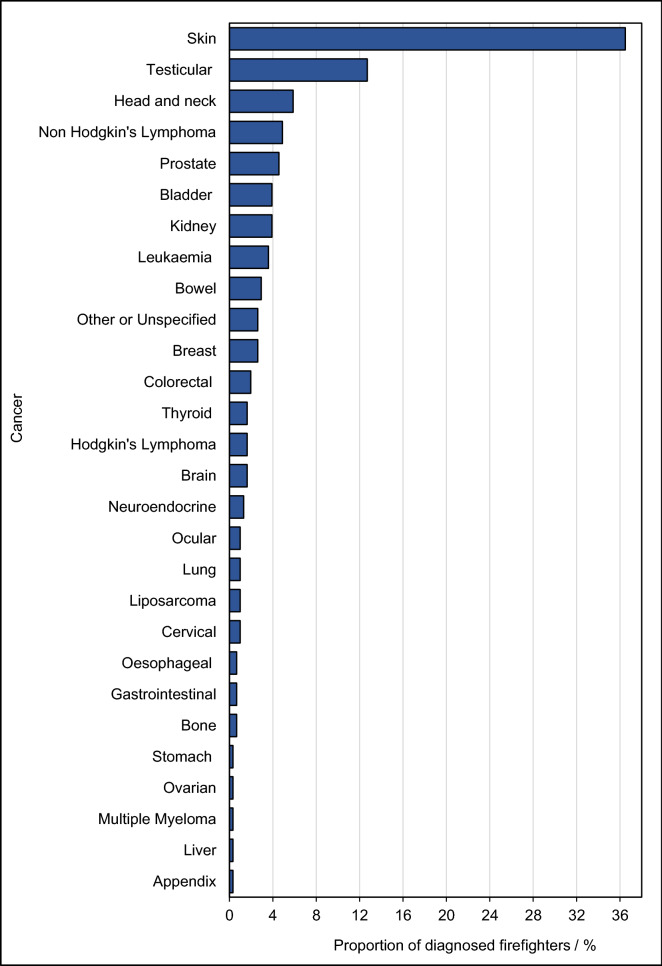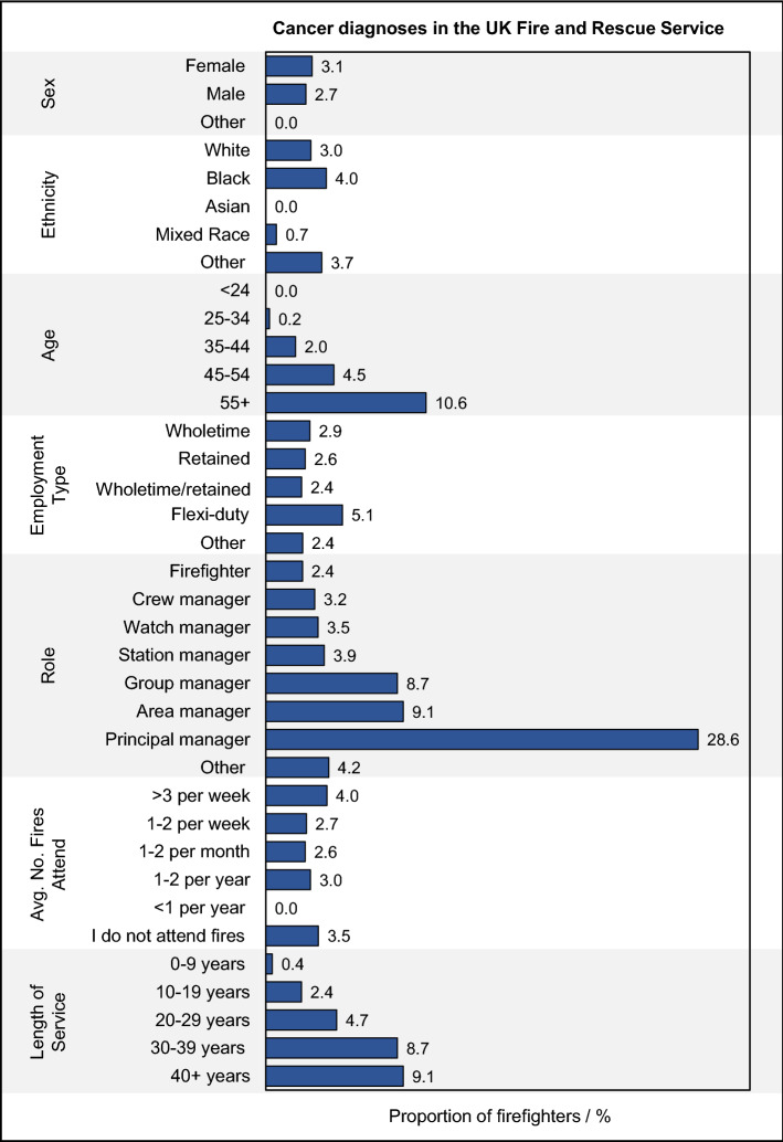 Firefighters suffer an increased risk of cancer from exposures to chemicals released from fires. Our earlier research has found that fire toxicants not only remain on firefighters' PPE, but are also tracked back to fire stations. The UK Firefighter Contamination Survey assesses firefighters' risk of developing cancer due to occupational exposure to fire toxins. Over 4% of surveyed firefighters were found to have a cancer diagnosis, with the age-specific cancer rate up to 323% higher (35-39 year olds) than that of the general population. Firefighters who had served ≥ 15 years were 1.7 times more likely to develop cancer than those who had served less time. Firefighters were at least twice as likely to be diagnosed with cancer if they noticed soot in their nose/throat (odds ratio (OR) = 2.0, 1.1-3.5), or remained in their PPE for more than four hours after attending a fire incident (OR = 2.3, 1.1-5.2). Also associated with an increased likelihood of cancer was: eating while wearing PPE (OR = 1.8, 1.2-2.7); failing to store clean/dirty PPE separately (OR = 1.3, 1.0-1.7); working in a station that smells of fire (OR = 1.3, 1.0-1.8) or not having designated (separated) clean and dirty areas (OR = 1.4, 1.1-1.7); using an on-site washing machine to launder fire hoods (OR = 1.3, 1.0-1.7); feeling that cleaning is not taken seriously at work (OR = 1.5, 1.2-2.0).